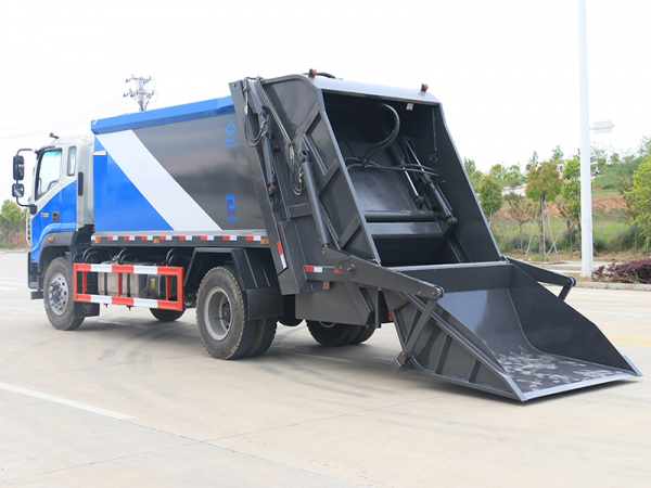 垃圾箱采用加强梁和钢板焊接而成牢固的框架结构,侧面和顶面为圆弧曲面,外形美观,重量轻,受力好,不变形;推铲由矩管骨架和折面板构成,不仅结构轻巧,又能使垃圾均匀分布,卸料干净彻底;填装器主要由填装器壳体、滑板、刮板等构件组成,各构件采用受力良好的梁板或箱型结构,结构牢固,重量轻。