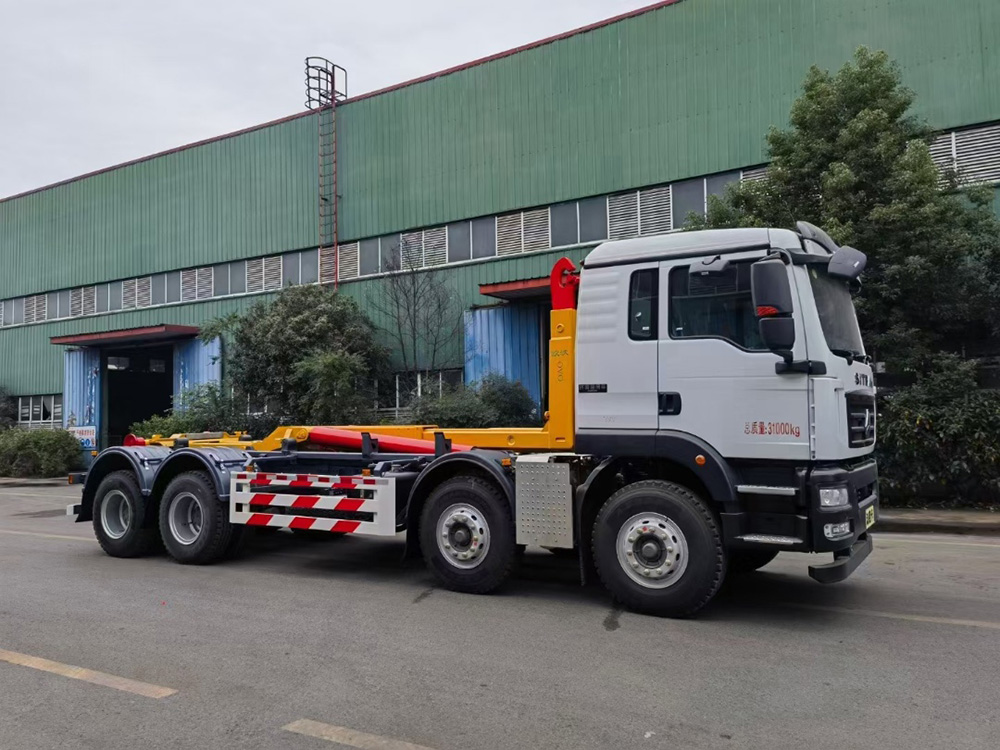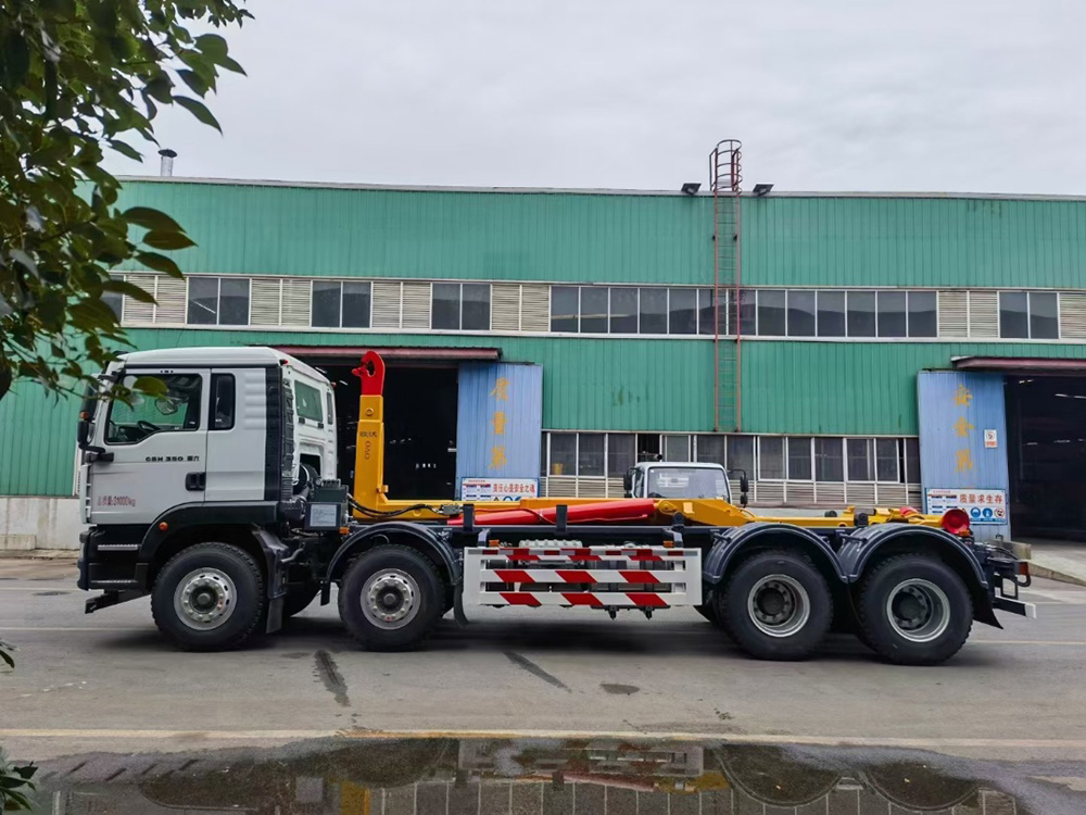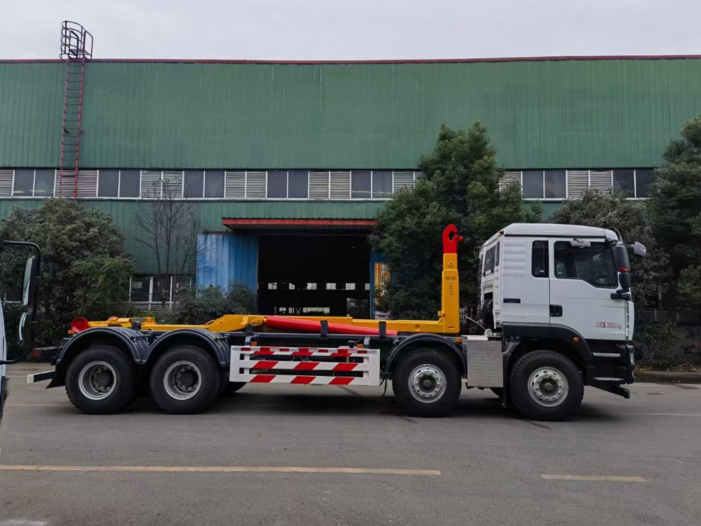 重汽汕德卡前四后八勾臂垃圾车。底盘型号:ZZ5316XXYN466GF1,潍柴350马力,G5-M系列驾驶室,轴距:1800+3800+1350或1800+3200+1350,豪沃10档变速箱,5.5吨前桥,11吨双后桥(选装12档变速箱,16吨双级轮减后桥),280大梁,11.00R20钢丝胎,300L油箱。全系标配:自动空调,四通道ABS,博世方向机,气囊座椅,电动玻璃,中控锁,摇控钥匙,可调节多功能方向盘,电动调节带加热后视镜