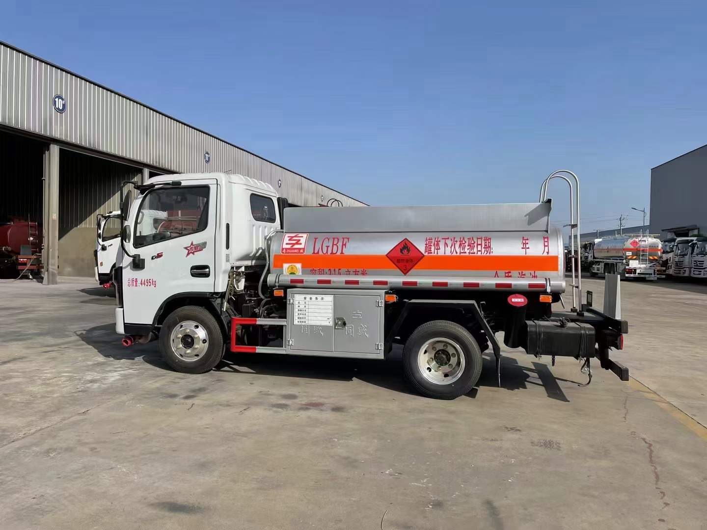上装配置: 严格按照公告尺寸制作罐体,罐体厚度大于等于 4.2mm,罐体材质:采用 Q235 优质碳钢板材,标配专用齿轮油泵(可泵进泵出);标配通仓带欧标全套下装油系统(含 1 个欧标罐盖,罐口内置呼吸阀,一个海底阀,1 个下装卸油阀、1 个油气回收阀、1 个油气回收接口、1 个防溢流探杆和插座);罐体顶部两侧带折叠升降防护栏,后置爬梯,操作箱内带语音报**系统装置,1 套气动组合开关,防静电盘;标配颜色灰色,罐体两侧正中贴橙色反光带,贴三个“易燃液体”标识,安全告示牌,其它均为厂家标配。