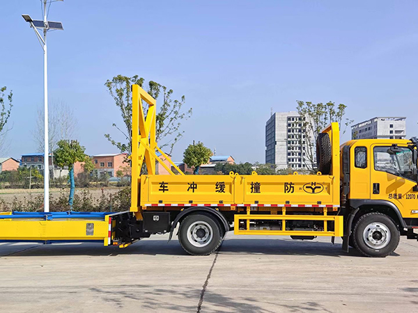上装配置:箱体采用国标优质板材制作,后部防撞缓冲模块包采用国际知名技术产品畅行达 100K防撞缓冲模块,带有**检测报告,矩阵式LED爆闪灯,能形成向左和向右的箭头指向,充当施工作业车辆后方的缓冲卫士。如若发生追尾事故,能够在肇事车辆和前方施工作业区域之间构建一个缓冲区域,通过机具结构变形吸收撞击的能量,**限度地降低被保护人员及设备遭到碰撞的几率。**电动液压**系统,性能稳定,安全可靠,可实现平稳举升和降落。